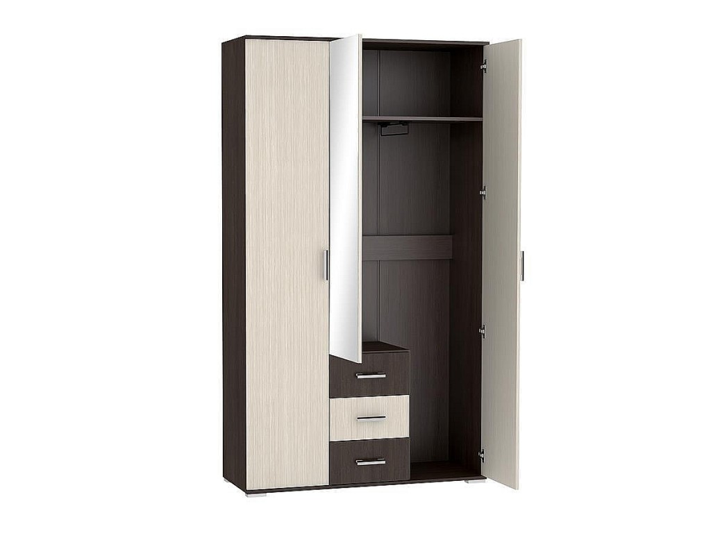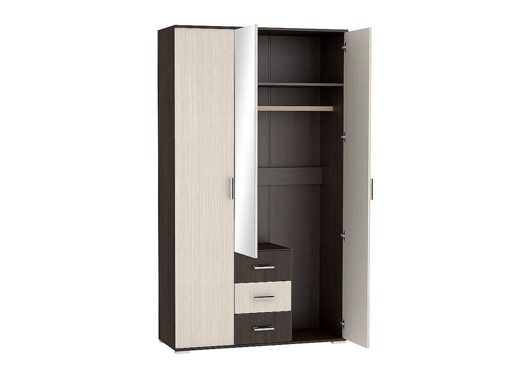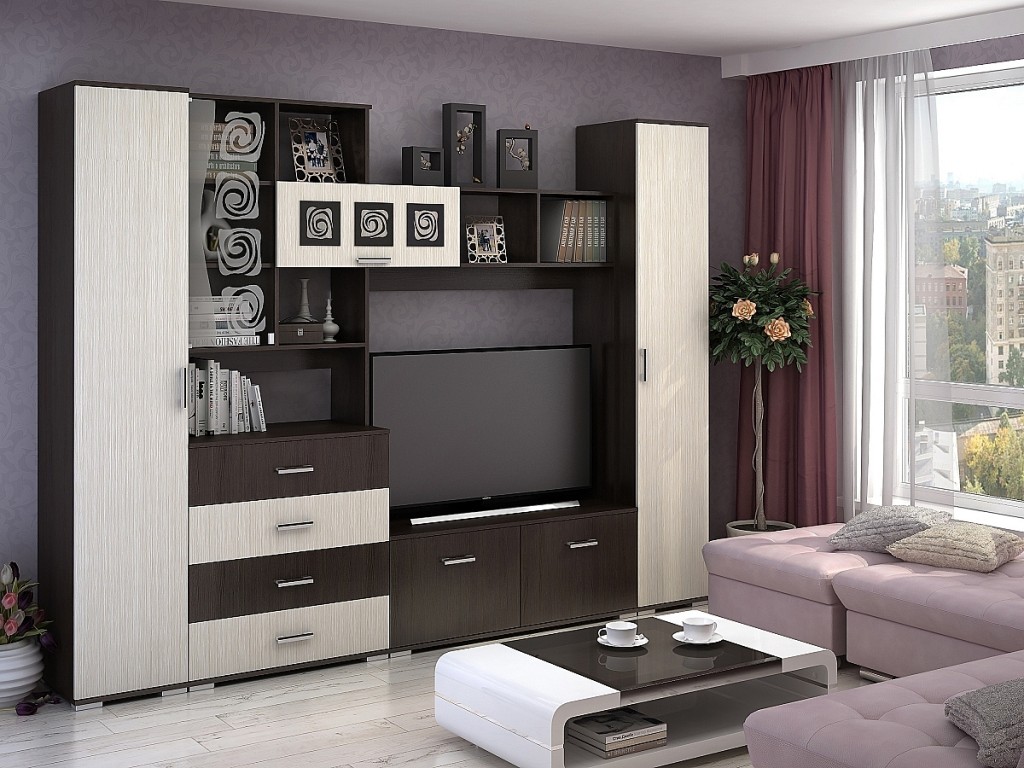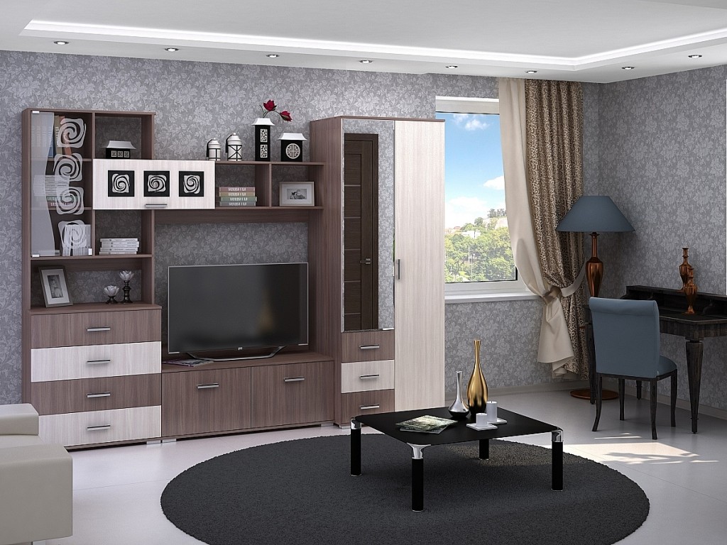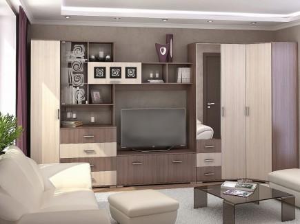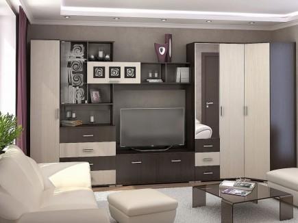 Разнообразные шкафы модульной гостиной – бельевые, платяные, угловые, одно- и двухстворчатые помогут эргономично разместить все необходимые вещи.