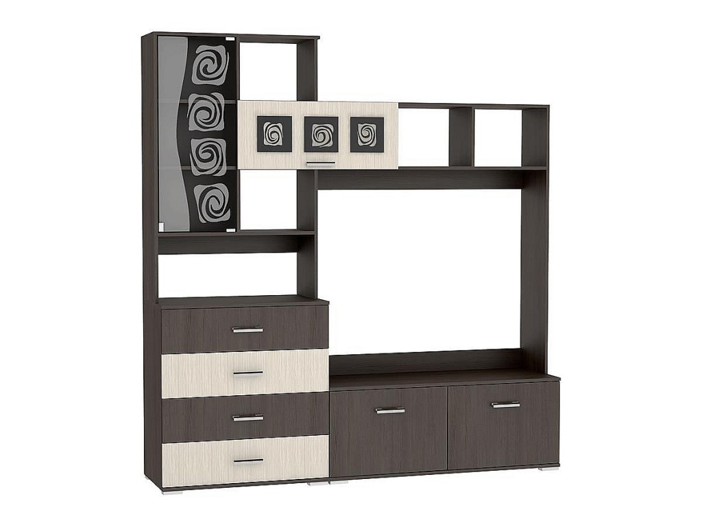 В нижней части – большая ниша под телевизор до 49 дюймов, а также пять вместительных ящиков и две закрытые полки.