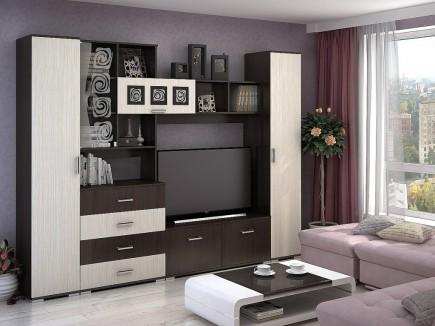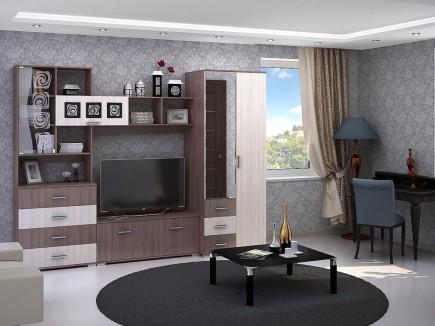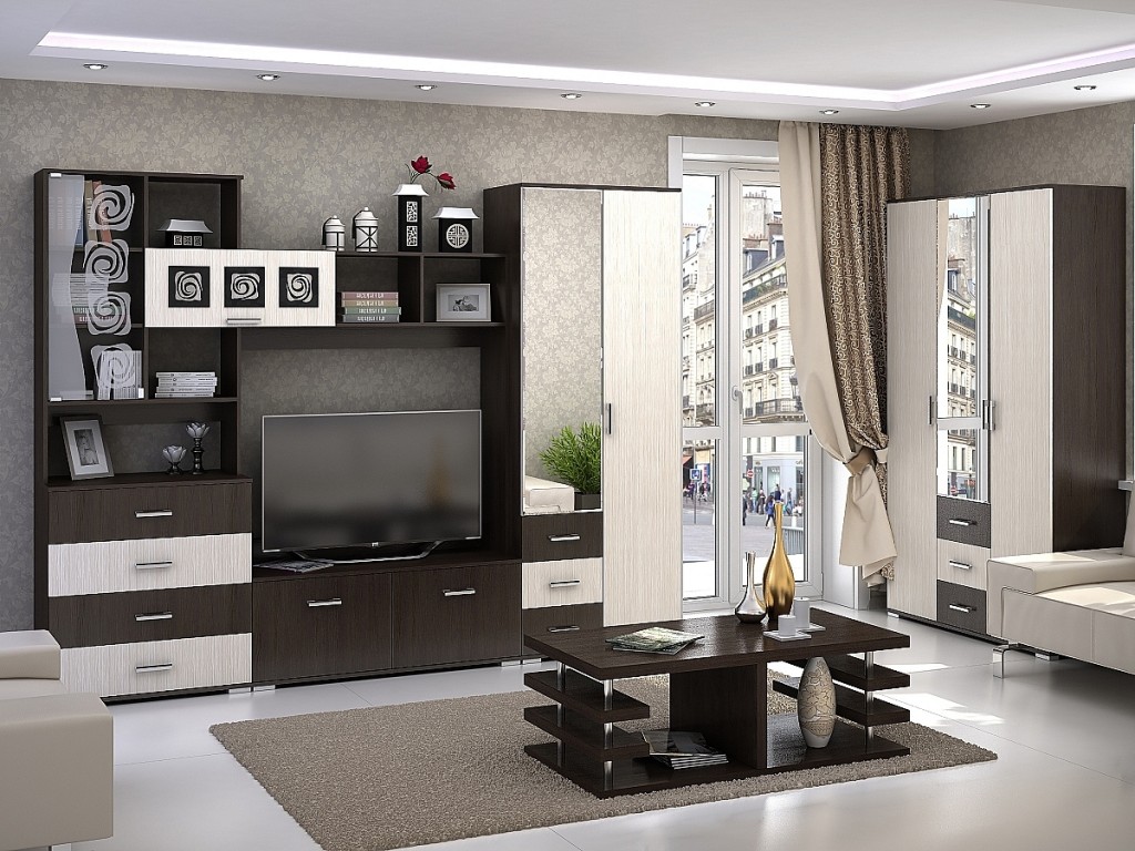 Отделка гостиной «Рошель» в двух сочетаниях цветов: Венге-Дуб белфорд и Ясень шимо тёмный-Ясень шимо светлый