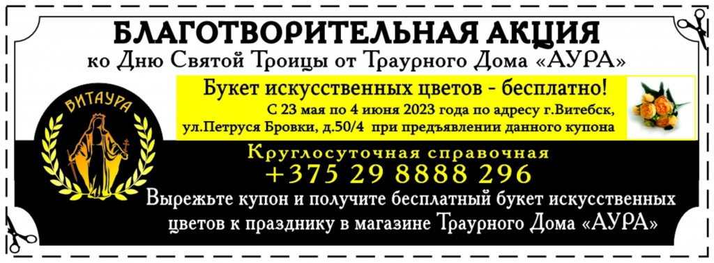 Друзья, в преддверии Святой Троицы от Траурного дома "АУРА" проходит акция: вырежи купон из газеты и получи бесплатный букет искусственных цветов к празднику.