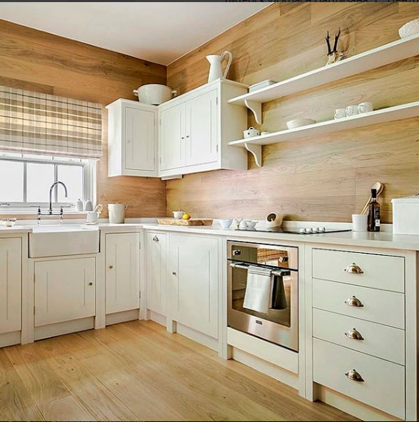 Ламинат в качестве рабочего фартука на кухне. Используя для кухни водостойкий ламинат, можно получить роскошную фактурную поверхность, не уступающую плитке по прочности и надежности. Кроме того, дизайнеры выгодно сочетают текстуру фартука с фасадами шкафов, создавая гармоничный дизайн уютной кухни.
