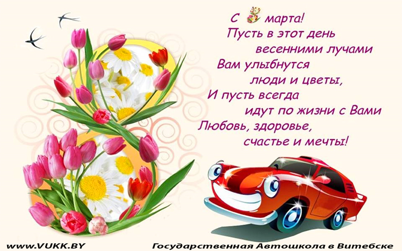 В день 8 Марта примите наши искренние поздравления, милые дамы, пусть рассветы тешат вас надеждами, дни радуют успехами, а закаты дарят нежность и гармонию, пусть вас любят, ценят, балуют подарками, удивляют приятными сюрпризами, пусть красота ваша и здоровье цветут, а желания и мечты сбываются!