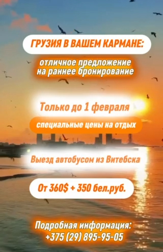 Стоимость путешествия начинается от 360 долларов + 350 руб. Выезд осуществляется автобусом из Витебска. Не упустите возможность!