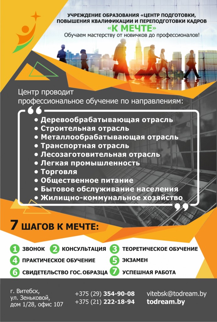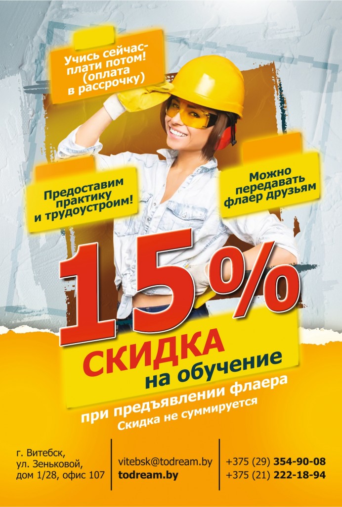 Заходи на сайт todream.by скринь флаер со скидкой 15% в разделе акции и обучайся по низкой цене. Акция распространяется на любую профессию!