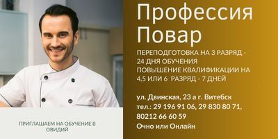 Обучение по профессии "Повар" можно начать сразу после окончания школы — всего за 40 дней вы получите все необходимые навыки и знания, а по окончании курса вам присвоят 3 разряд.