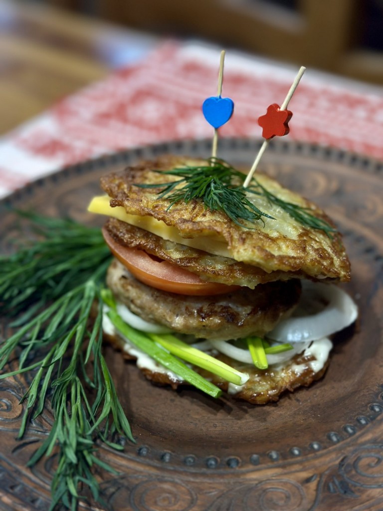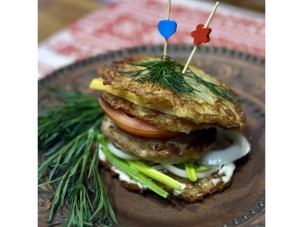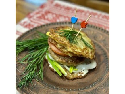 Это аппетитный бургер с нежной котлетой из свинины, свежими овощами и нашими фирменными соусами и драниками из картофеля. Он идеально подойдет как для любителей традиционной кухни, так и для тех, кто хочет попробовать что-то новое и необычное!