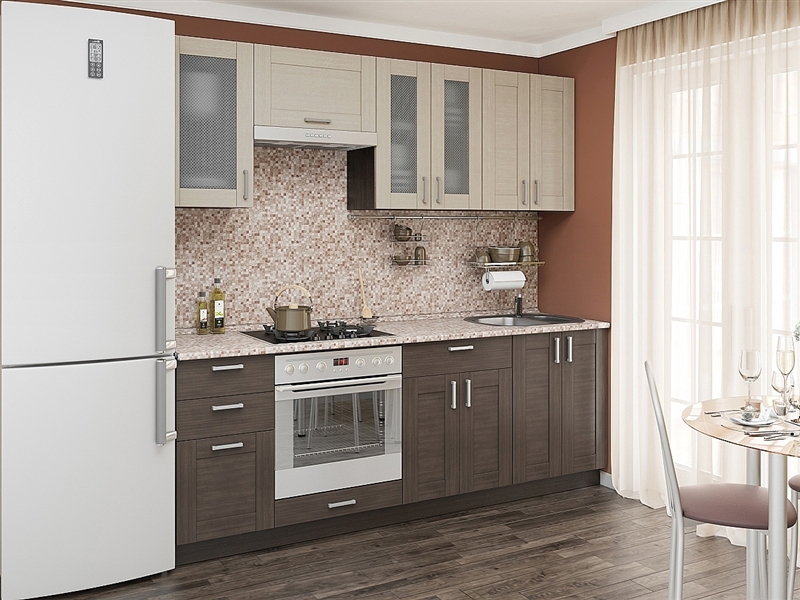 Минимализм стиля кухни выражается в строгих прямоугольных формах рамочно-филёнчатых и щитовых фасадов, в тонах отделки Cappuccino и Wenge Veralinga.