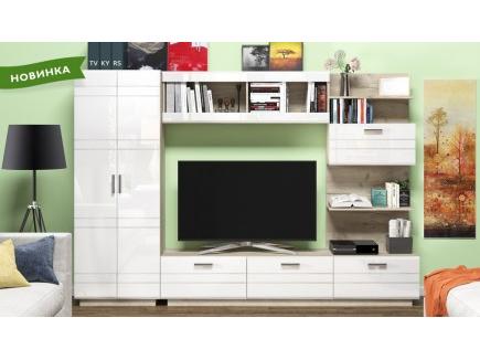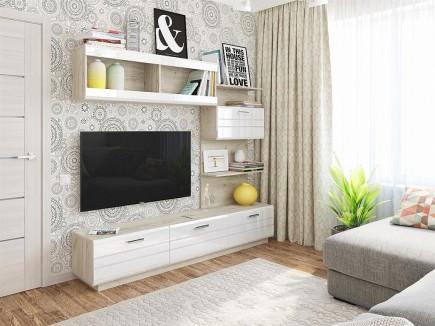 Состоит из центральной тумбы и платяного двустворчатого шкафа. Гостиная идеально впишется в современный интерьер, а глянцевая поверхность фасадов позволит зрительно увеличить пространство.