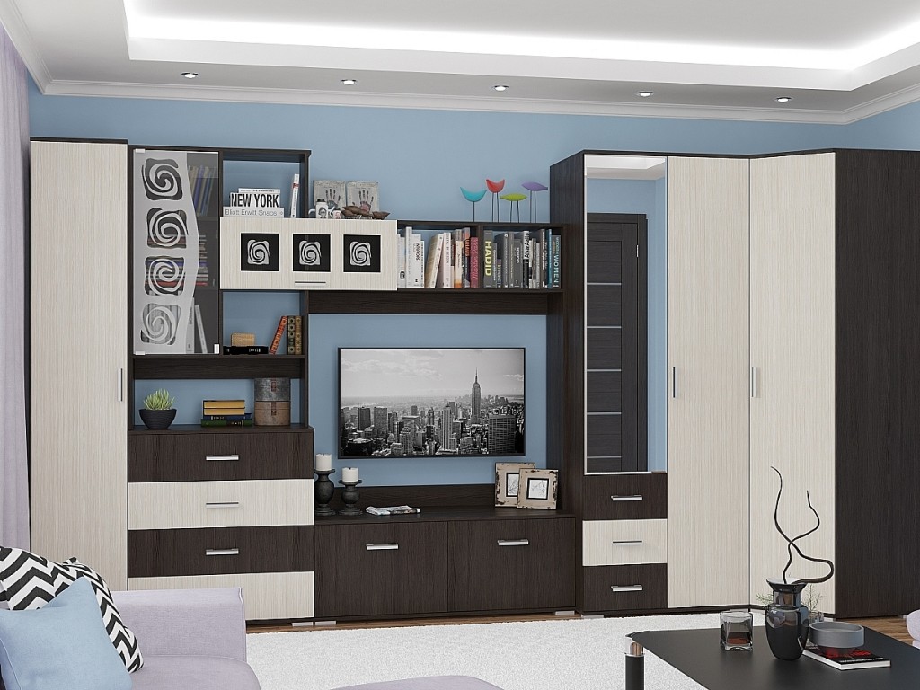 Разнообразные шкафы модульной гостиной – бельевые, платяные, угловые, одно- и двухстворчатые помогут эргономично разместить все необходимые вещи.