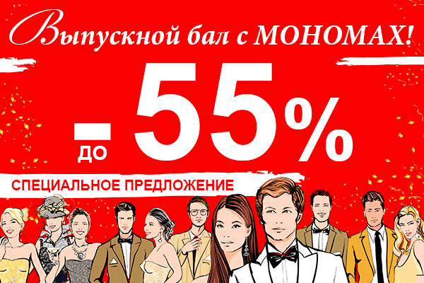 Скидки до -55%! Для всех выпускниц нашей страны, и не только! Специальная акция «Выпускной бал с «Мономах» продолжается! Последние пять весенних дней скидки увеличены до -55%. Дополняйте свой праздничный образ ювелирными украшениями и будьте самыми красивыми!