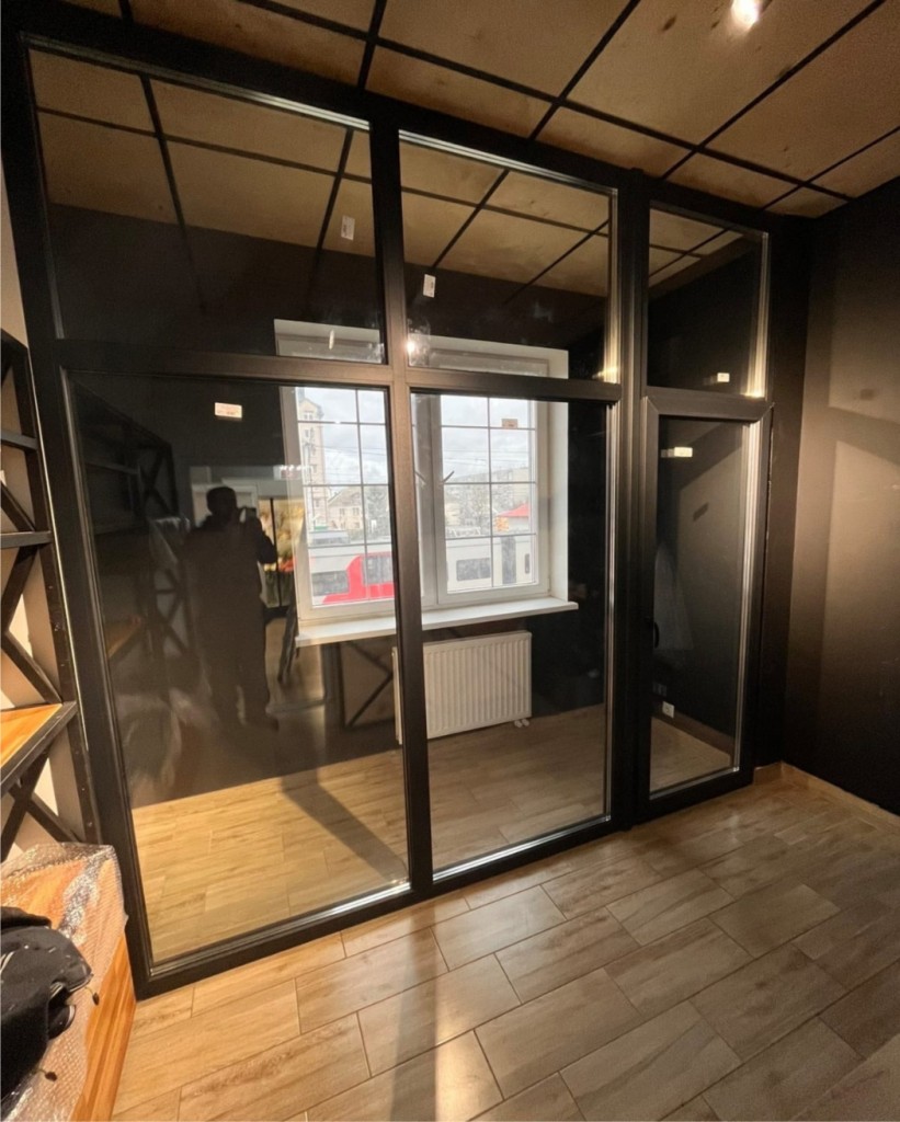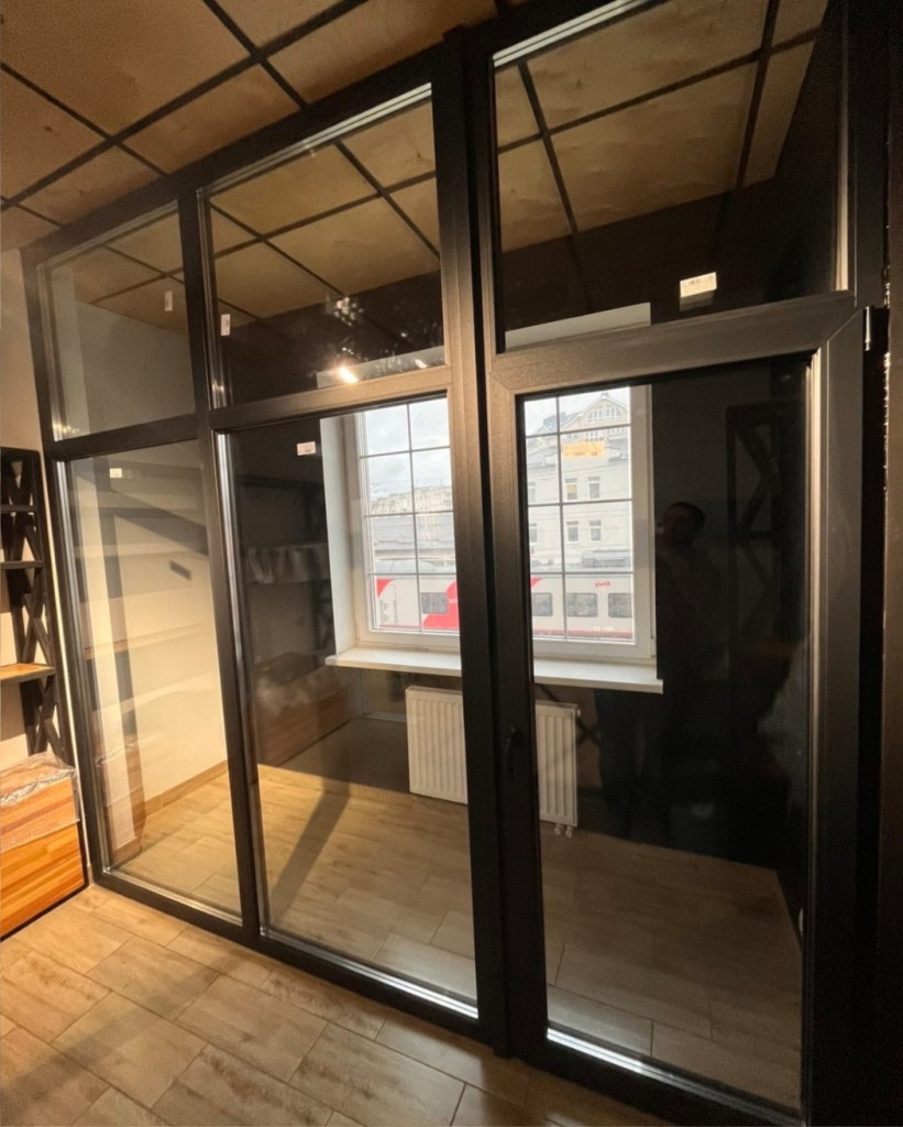 Выполнено остекление перегородки небольшого рабочего кабинета.