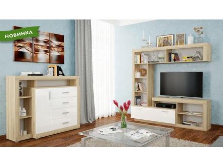 Представляем Вашему вниманию новую гостиную «Берген» в цвете Белый глянец/Дуб Сонома: тумба центральная размером В*Ш*Г, мм -1704*1702*413, и комод с четырьмя ящиками размером В*Ш*Г, мм -1044*1360*403