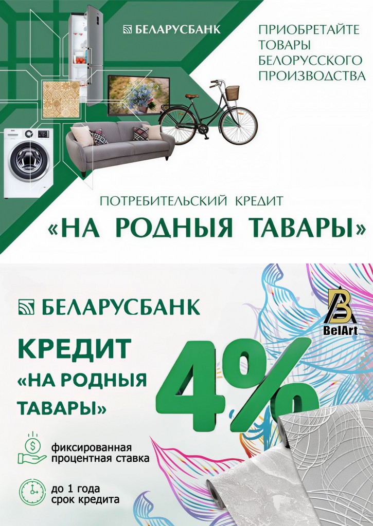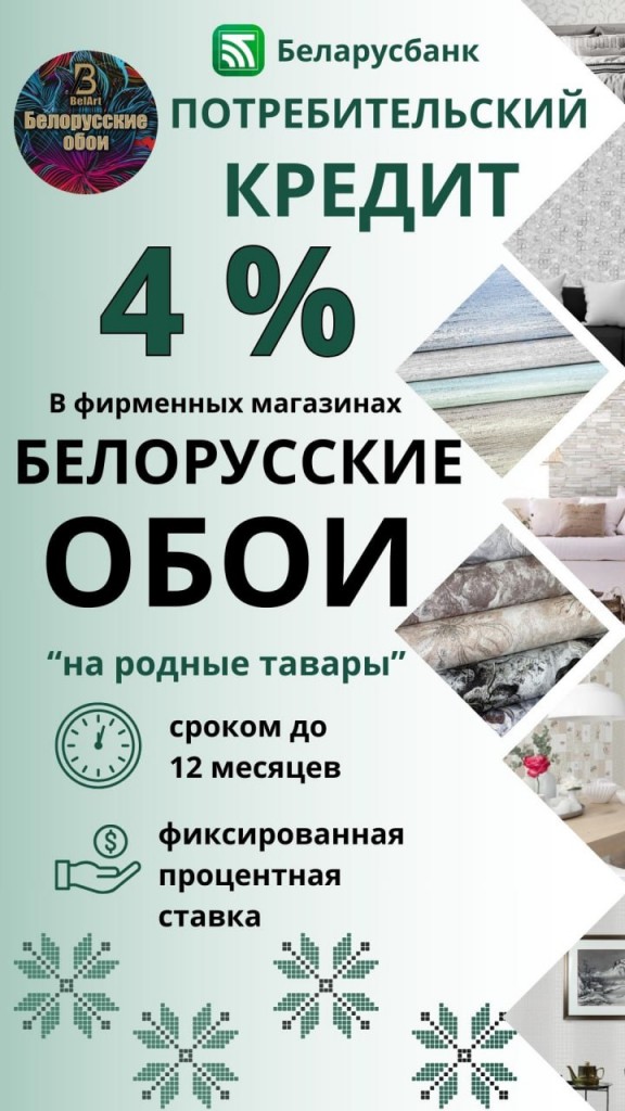 Рады сообщить, что фирменные магазины "Белорусские обои" включены в список участников программы потребительского кредита от Беларусбанка. Теперь у вас есть возможность приобрести наши обои под 4% годовых на срок до 12 месяцев.