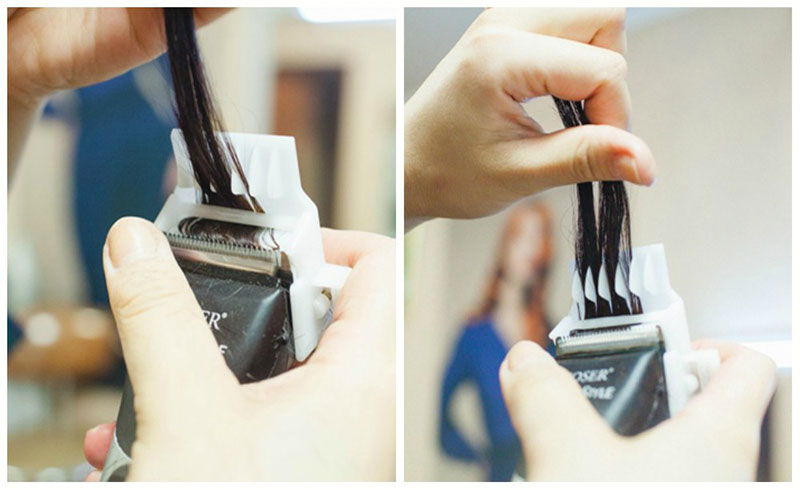 Специальная насадка позволяет срезать только кончик волоса, даже если кончик короче основной длины, что практически невозможно сделать при обычной стрижке. Благодаря срезу ножевым блоком машинки, кончик срезанного волоса имеет более ровный край, в отличии от среза ножницами, где край кончика получается более рыхлый.