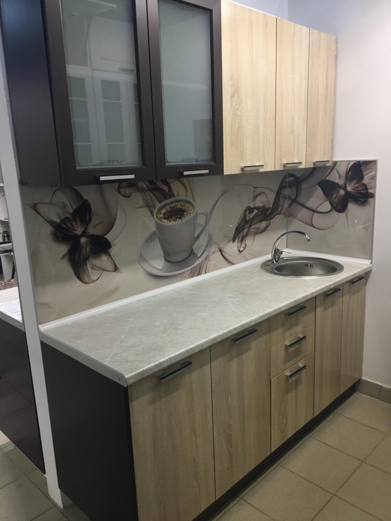 Цена указана за верхние и нижние модули, столешницу, ручки, сушку, лоток, планки для столешницы, навесы, шину, уплотнитель для цоколя из ДСП, стеновую панель с планками, плинтус, мойку с сифоном, смеситель.