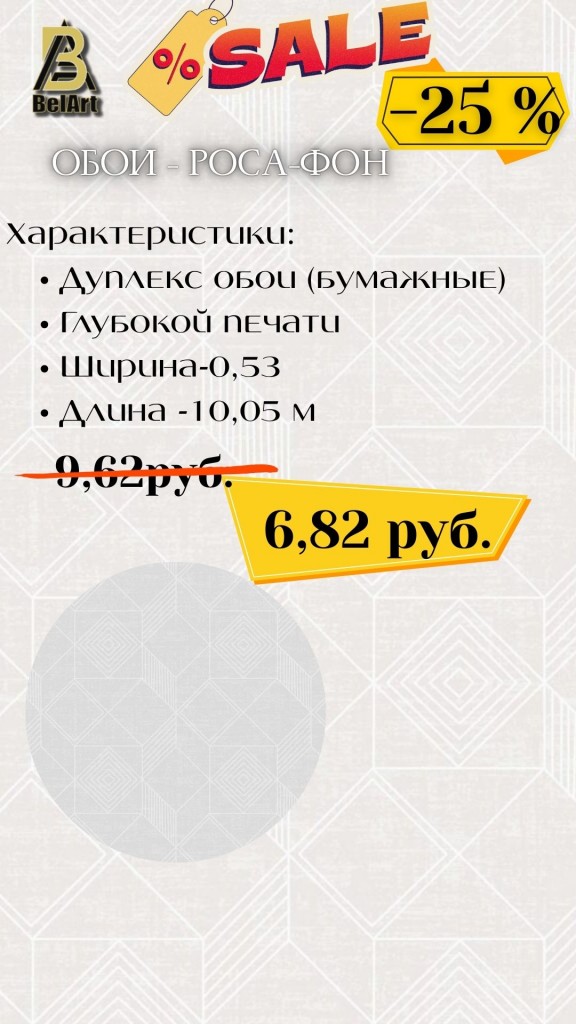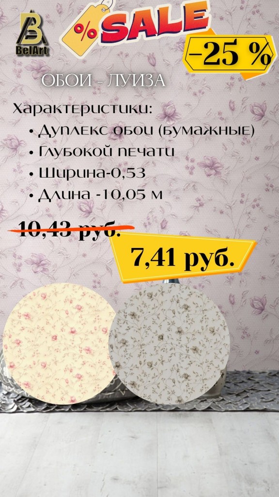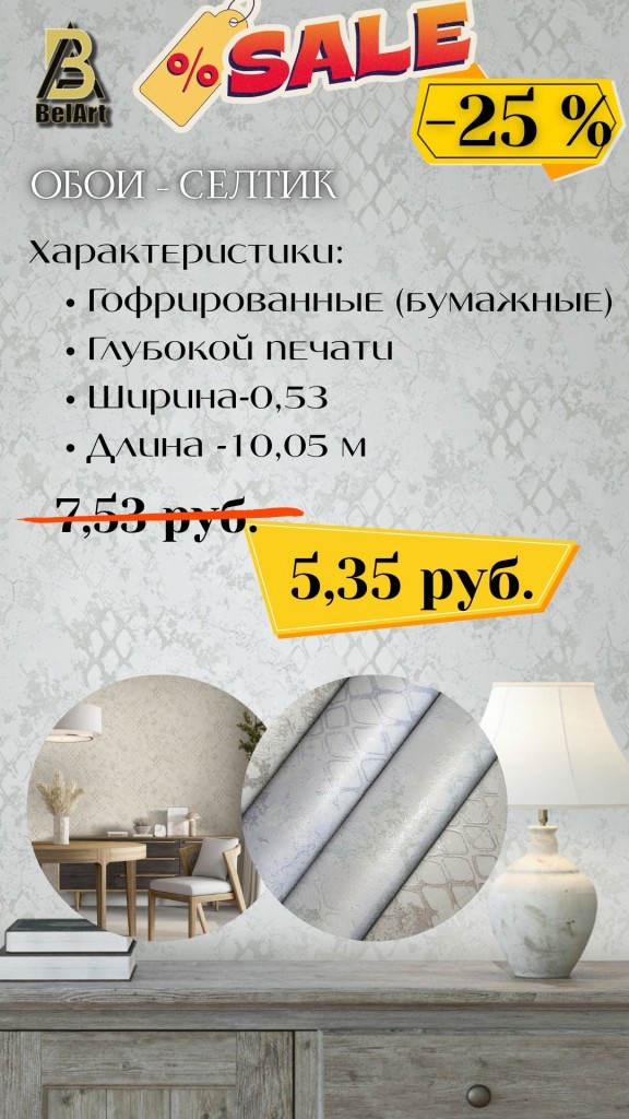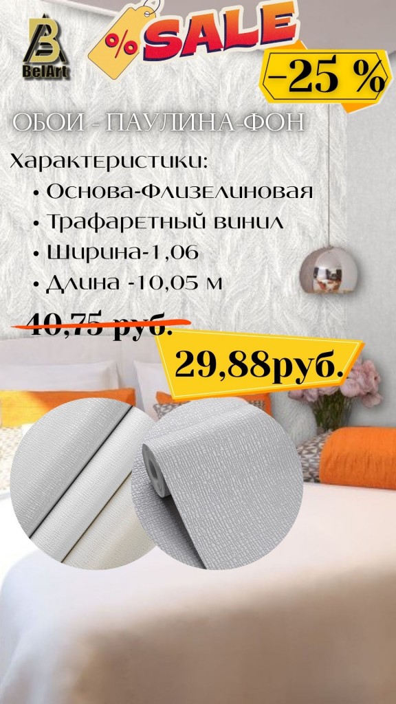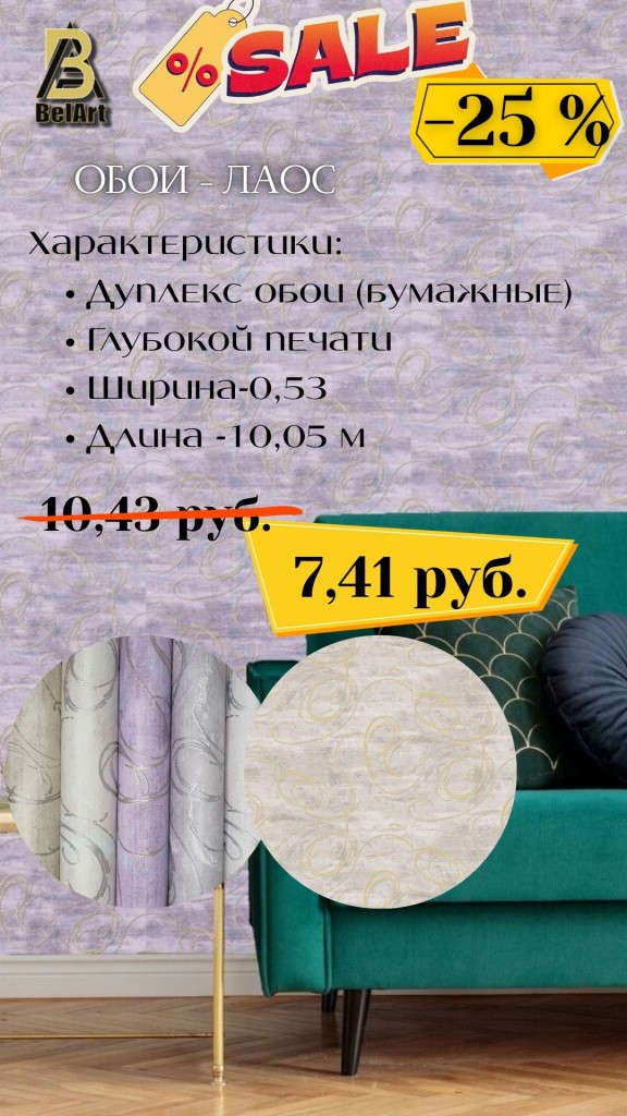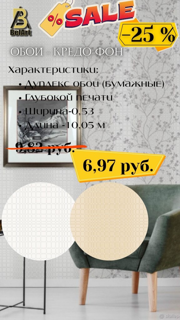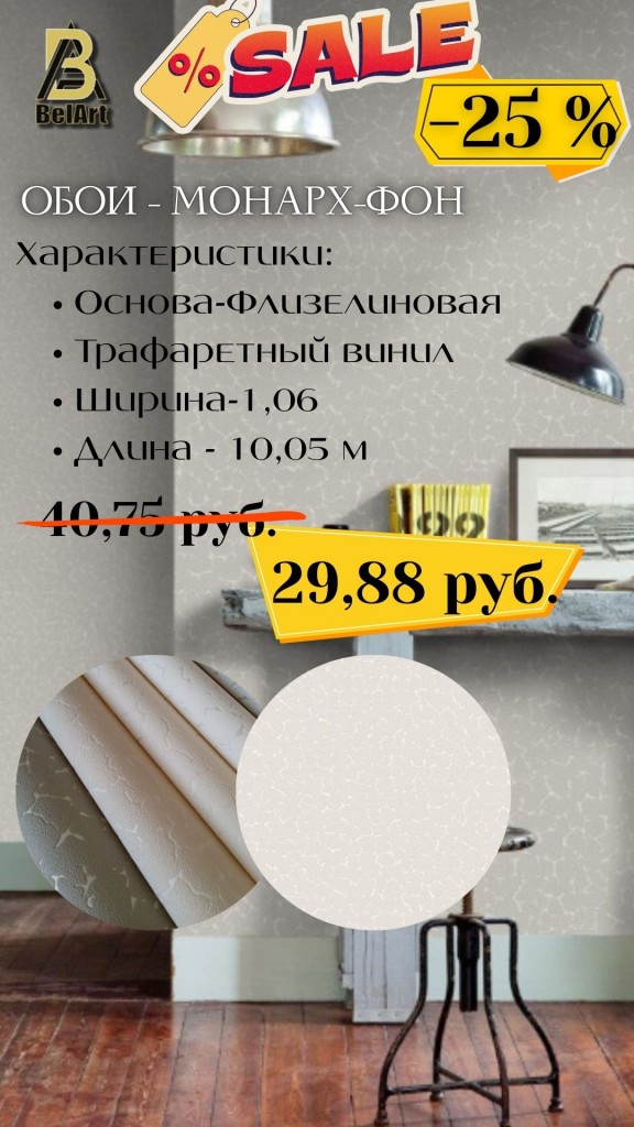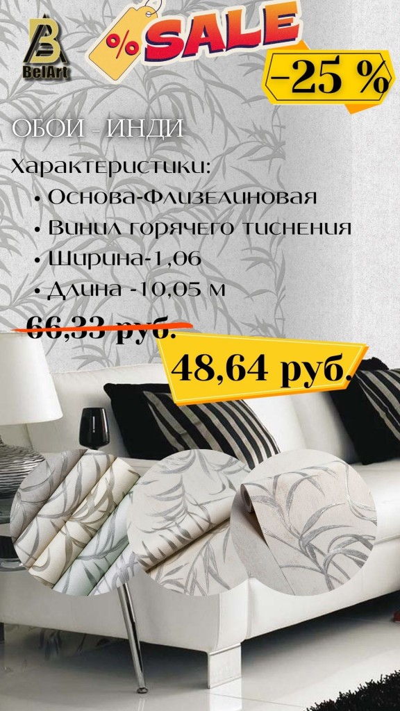 В магазине "Белорусские обои" стартовала отличная акция! Теперь вы можете приобрести качественные обои со скидкой 25%. Это отличная возможность обновить интерьер вашего дома или офиса по выгодной цене. Спешите, акция действует не на все коллекции! Смотрите желтый ценник) Загляните в магазин и выберите обои, которые подойдут именно вам.