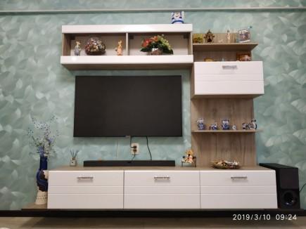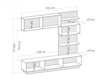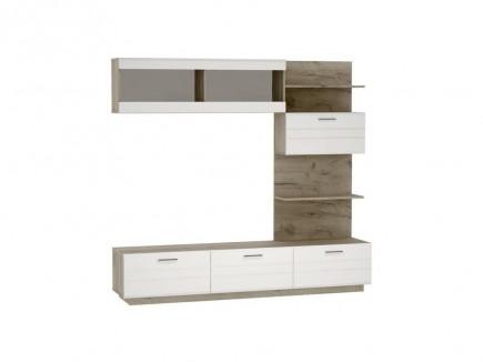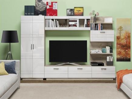 Состоит из центральной тумбы и платяного двустворчатого шкафа. Гостиная идеально впишется в современный интерьер, а глянцевая поверхность фасадов позволит зрительно увеличить пространство.