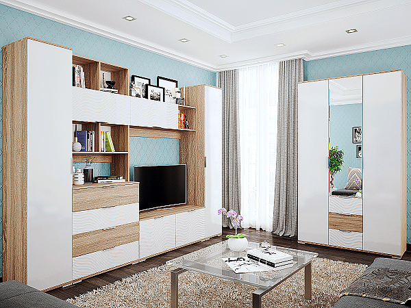 Стильная гостиная «Терра» с декоративными рельефными вставками идеально подойдет для современного интерьера. Сочетание рисунка натурального дерева с глянцевыми фасадами зрительно расширяет пространство, а модульная система позволит создавать свой уникальный интерьер в гостиной.
