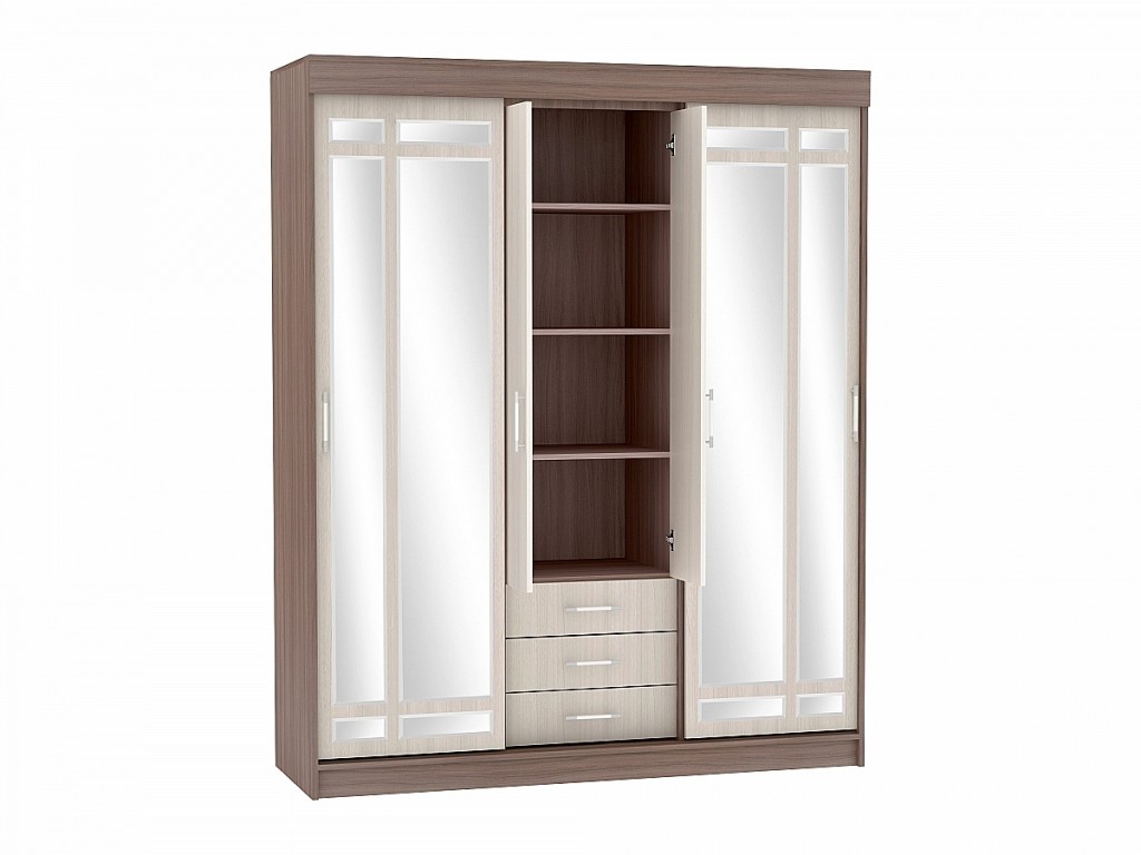 Практичный, функциональный и вместительный шкаф-купе «Фаворит» включает в себя удобные большие полки, антресоль, платяное отделение со штангой, множество выдвижных ящиков и секций. Симметричное оформление боковых дверей зеркалами придает многогранность и добавляет света помещению.