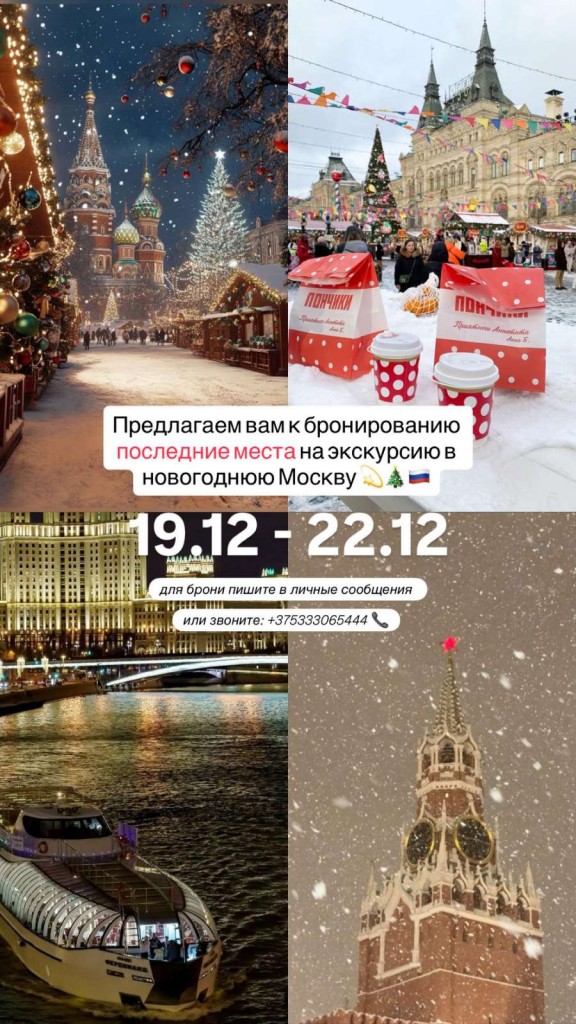 Турфирма «Спадчына» приглашает вас в волшебное путешествие в сердце зимней сказки — на тур «Москва в Рождественском сиянии» с 19 по 22 декабря!