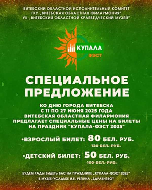 В честь Дня города Витебска, с 11 по 27 июня 2025 года Витебская областная филармония дарит скидки на билеты на праздник "Купала-Фэст 2025" в музее-усадьбе И.Е. Репина "Здравнёво":