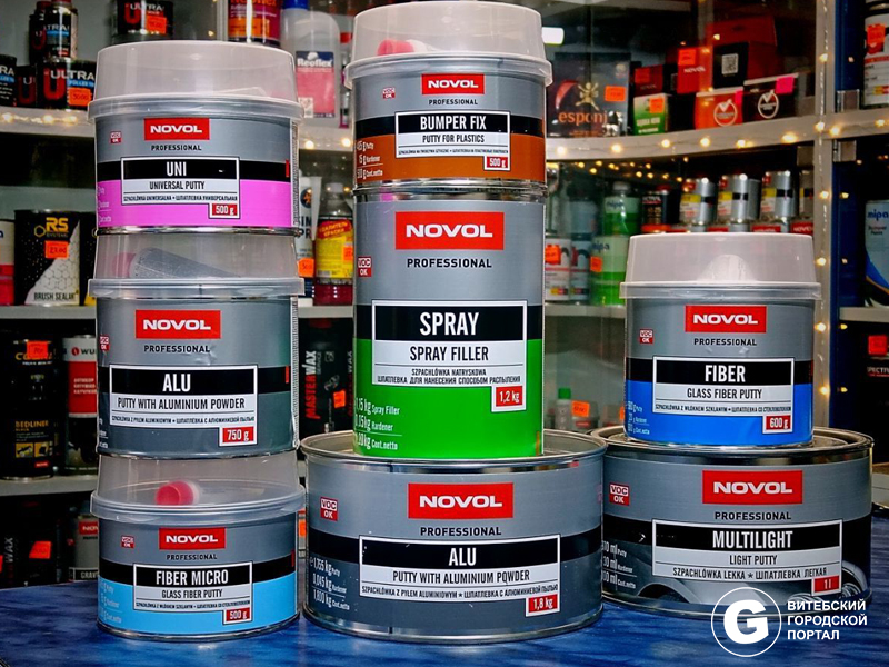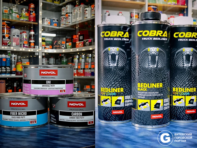 Помимо краски, в наличии всегда: лаки, растворители, шпатлёвки, грунты, порозаполнители, отвердители, материалы для пластика и водоразбавляемые системы.