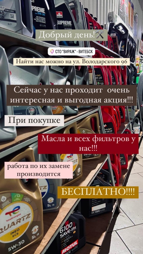 Приглашаем вас в СТО «Вираж»! Только сейчас вы можете приобрести масло и фильтры со скидкой и получить бесплатную замену!