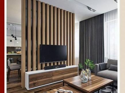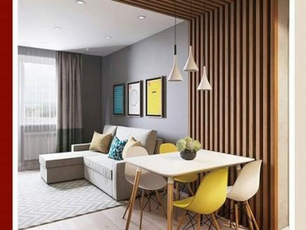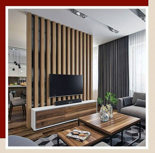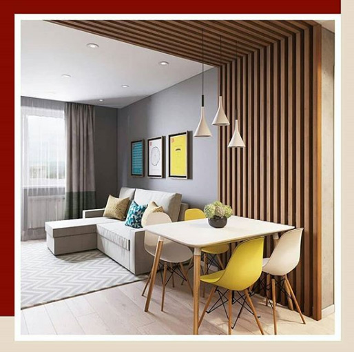 Конструкция из деревянных реек от пола до потолка — это, пожалуй, самый популярный среди дизайнеров на данный момент способ зонирования.