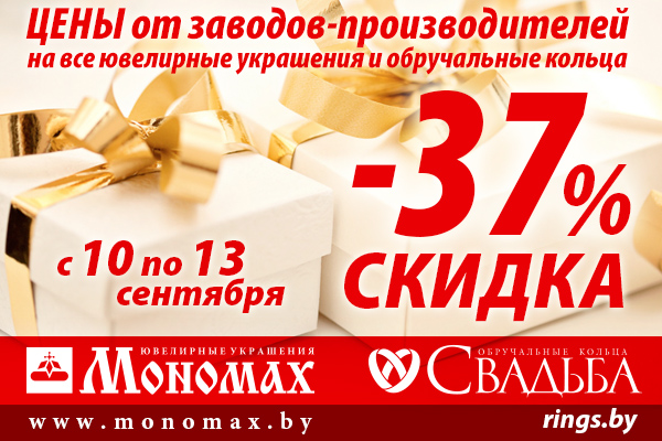Только сейчас, в ювелирной сети «Мономах» и в салонах обручальных колец «Свадьба» и Обладатели карты рассрочки «Халва» от МТБанка и «Черепаха» от банка ВТБ могут рассчитывать на скидку в 10%. Преображаемся сейчас! |