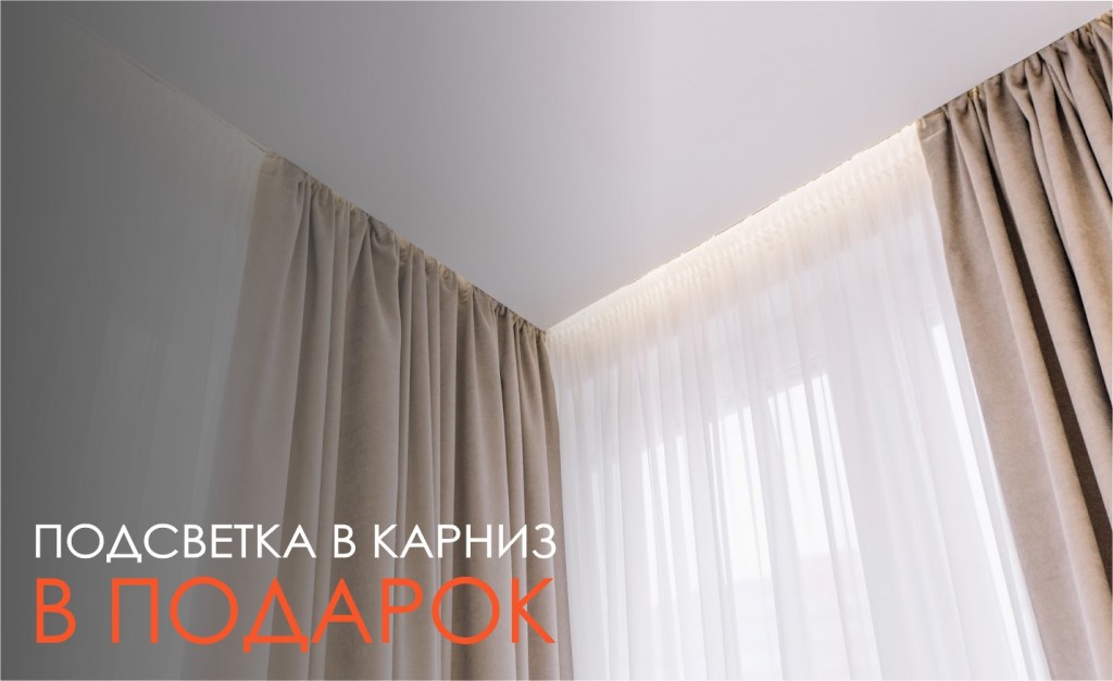 Хотите добавить изюминку в свой интерьер? Тогда эта акция для Вас! Только в июне! При покупке натяжного потолка подсветка в карниз - в подарок! Подсветка создает особую атмосферу в интерьере. Ее можно использовать как ночник, либо для создания непринужденной расслабляющей обстановки. Подробности акции уточняйте у менеджеров компании.