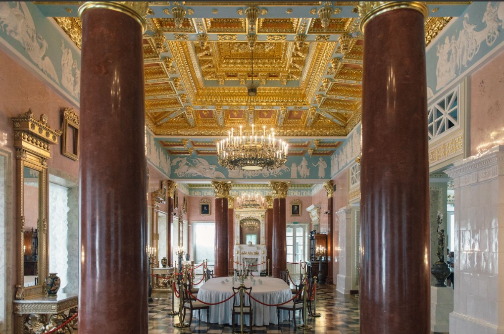 Обращают на себя внимание сохранившиеся кессонные потолки в изящной лепнине — их разнообразие поражает! Лепные украшения и орнаменты в некоторых комнатах присутствуют и на стенах. Здание дворца выдержано в едином классическом стиле — здесь присутствуют все характерные его детали: портики, арки, колон.