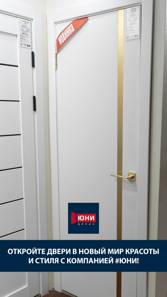 Мы рады представить Вам наши 4 новые модели межкомнатных дверей Эмаль Line от компании ЮНИ, которые воплощают элегантность и современность. Каждая дверь сочетает в себе итальянскую эмаль и изысканные линии из высококачественного композитного материала, доступные в шикарных черном и золотом цветах.