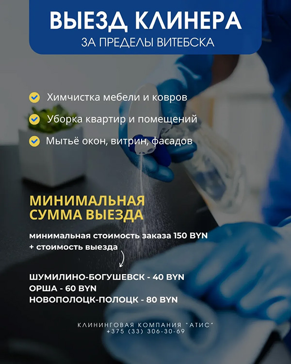 Если вы живёте в Орше, Богушевске, Шумилино, Полоцке или Новополоцке, вы можете воспользоваться нашими услугами на выезде. Наша команда приезжает к вам и обеспечивает безупречную чистоту в доме.