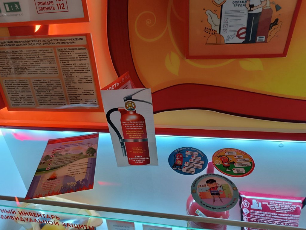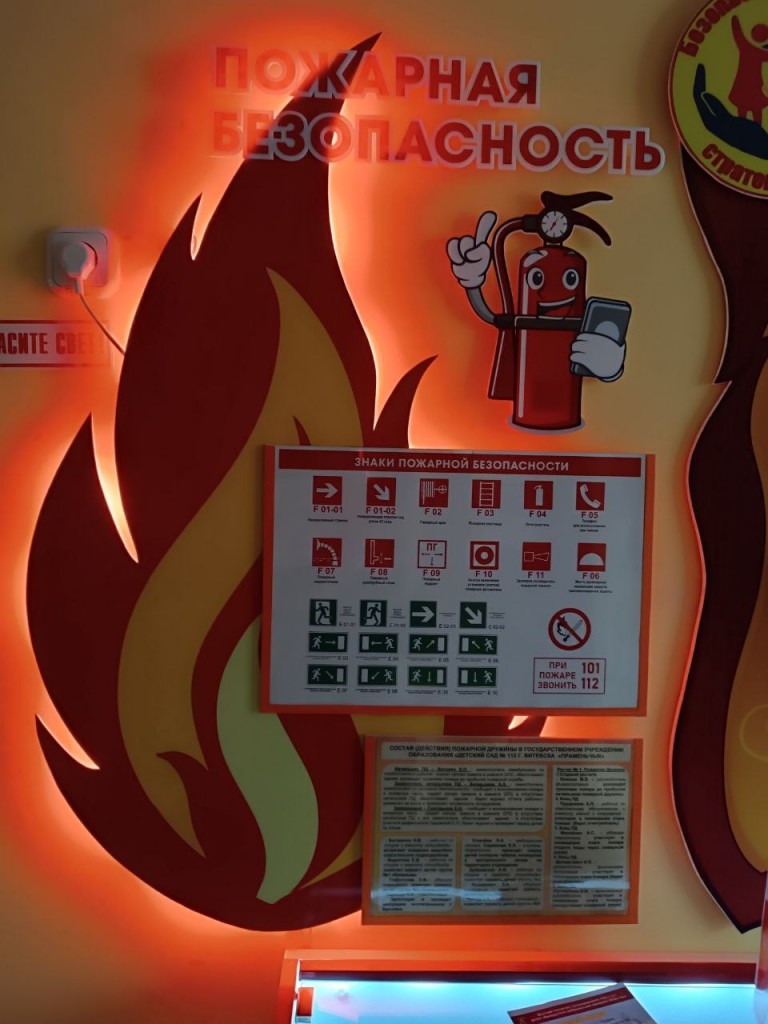 Члены добровольного пожарного формирования 2 типа, работники дошкольного учреждения образования детский сад №112 г. Витебска сделали наглядный стенд по пожарной безопасности, с размещением на нем не только первичных средств пожаротушения, но и наглядно-изобразительной продукции.