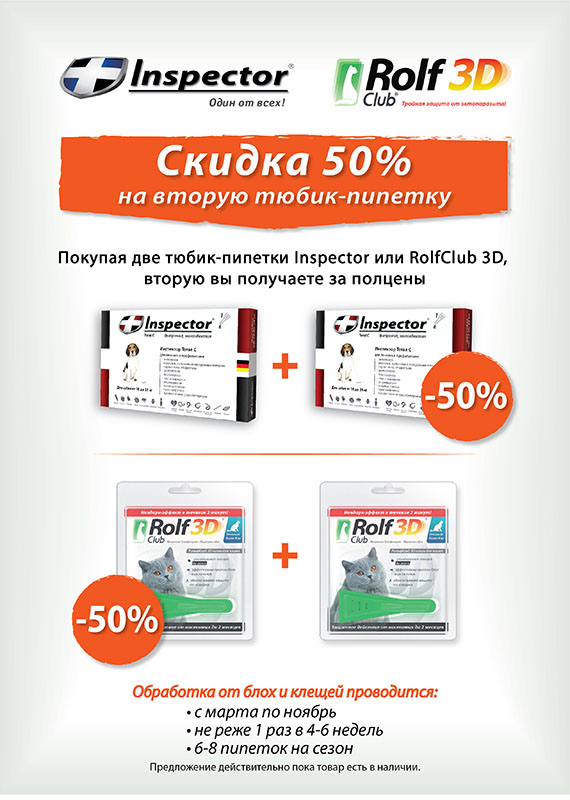 Долгожданная новость для наших покупателей! АКЦИЯ при покупке капель "Инспектор" и "Рольф Клуб 3D". При единовременной покупке двух пипеток (одного наименования) "Капли Инспектор" или "Капли Рольф Клуб 3D" скидка 50 % на вторую пипетку!