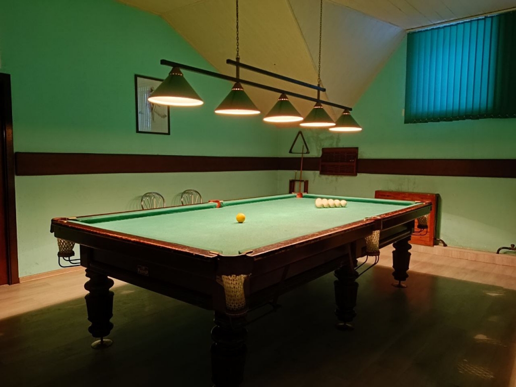 Бильярд Для любителей активного отдыха будет возможность сыграть партию в бильярде! Вместе с друзьями Вы можете посоревноваться в мастерстве «забивать шары». Для этого имеется стол для русского бильярда. Просторная большая комната позволяет без труда расположиться всем любителям увлекательной игры.