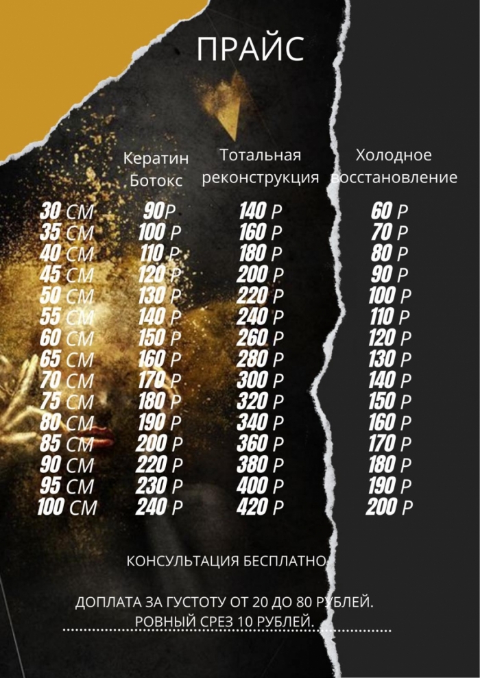 • укрепление волос препаратами по уходу за волосами (цена зависит от длины волос) - от 11.00 руб. - до 13.00 руб.