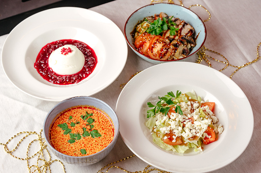 - Стейк из форели / салат «Чука» (филе форели, обжаренное в хоспере, подается в сочетании с миксом из водорослей чука, свежего огурца, красного перца с семенами кунжута и ореховым соусом)