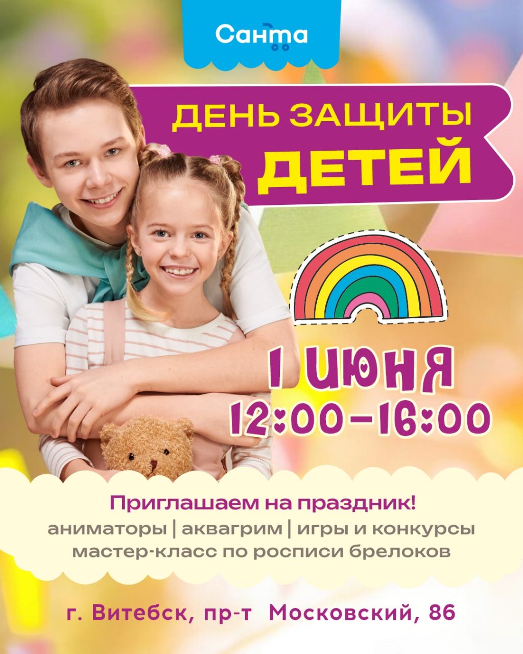 В это воскресенье, 1 июня, сеть магазинов «Санта» приглашает всех желающих отметить День защиты детей в Витебске по пр-т Московский, 86. Мероприятие пройдет с 12:00 до 16:00 и обещает стать ярким и запоминающимся.