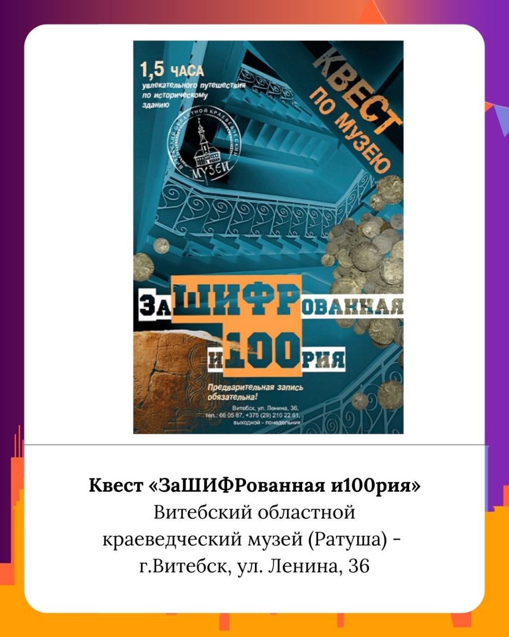 "Тайны старой Ратуши" разгаданы и заархивированы! Друзья, представляем вам новый квест по музею "ЗаШИФРованная и100рия": 8 музейных локаций, 7 вариантов заданий, 1,5 часа увлекательной игры, Интересно и познавательно! Что же означает 100? Одновременно участвовать в игре могут большие группы (до 45 чел.)!