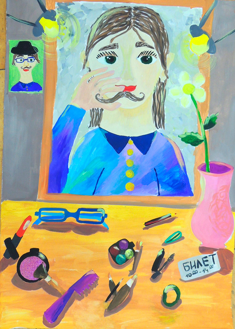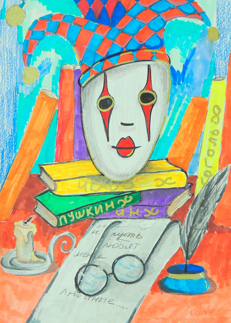 Погрузившись в эту тему, многие рисовали школьный и домашний театр: ручки с игрушками, силуэты театра теней. Дети изобразили жизнь актера на сцене и за кулисами, заглядывая в гримерку и костюмерный цех.