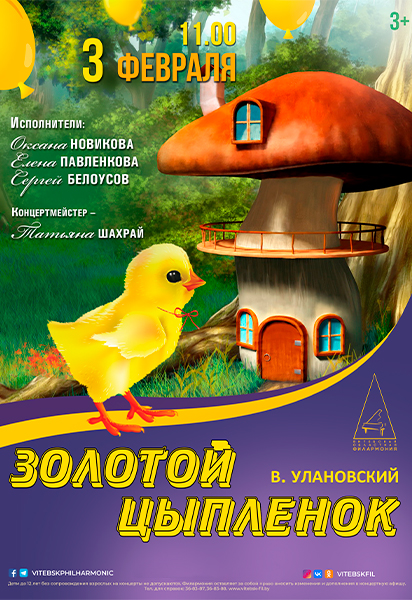 В витебской филармонии ближайшие дни посвящены самым маленьким ценителям искусства. 3 февраля для них приготовлена музыкальная сказка «ЗОЛОТОЙ ЦЫПЛЁНОК» 2+, а в воскресенье - «КАРАМЕЛЬКА И ГОРОШИНКА В ИНТЕРНЕТЕ» 3+.