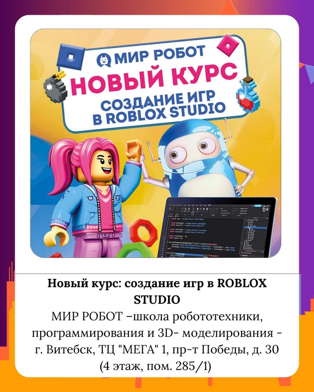 А для юных любителей технологий МИР РОБОТ – школа робототехники, программирования и 3D-моделирования запускает «Новый курс: создание игр в ROBLOX STUDIO». Отличная возможность освоить новые навыки и раскрыть свой творческий потенциал!