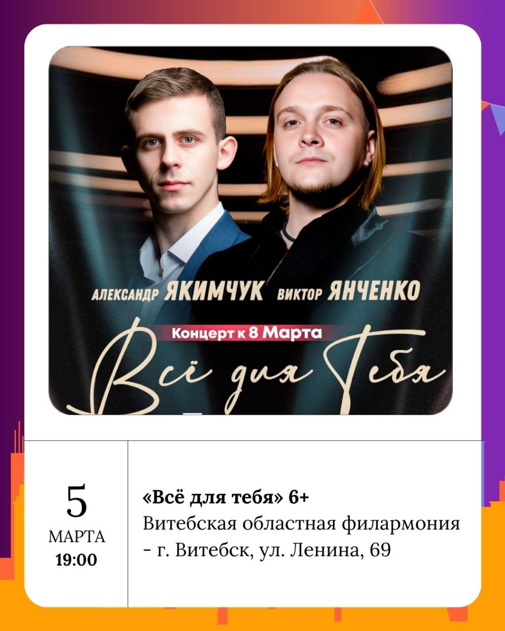 В предверии Международного женского дня Витебская областная филармония приглашает на концерт «Всё для тебя» (6+). Прекрасный повод порадовать себя и своих близких красивой музыкой.