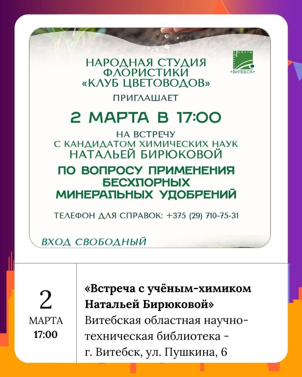 Начните неделю с познавательной встречи! Витебская областная научно-техническая библиотека приглашает на «Встречу с учёным-химиком Натальей Бирюковой». Отличная возможность расширить кругозор и узнать что-то новое.