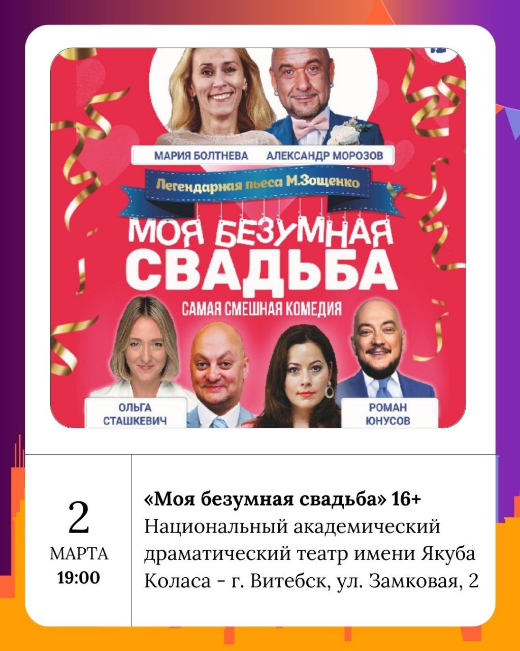 Для любителей театра Национальный академический драматический театр имени Якуба Коласа представит спектакль «Моя безумная свадьба» (16+). Обещает быть весело и интригующе!