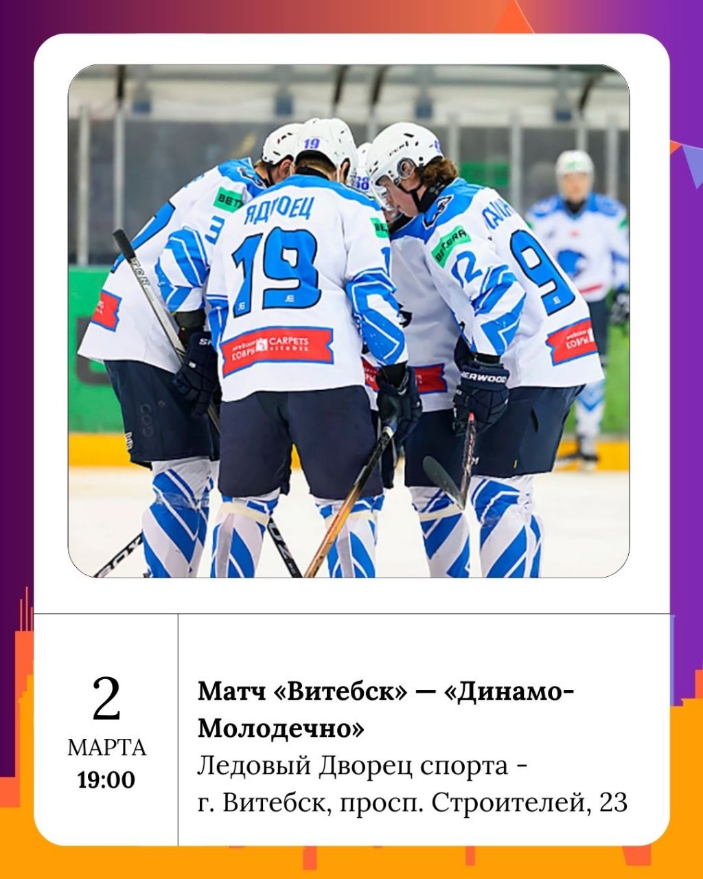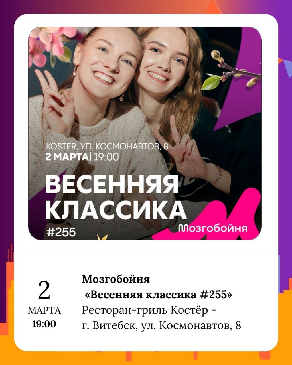Если вы предпочитаете активный отдых и интеллектуальные игры, присоединяйтесь к Мозгобойне «Весенняя классика #255». Проверьте свои знания и логику в компании друзей! А для фанатов хоккея – захватывающий матч «Витебск» — «Динамо-Молодечно» в Ледовом Дворце спорта. Поддержите любимую команду!
