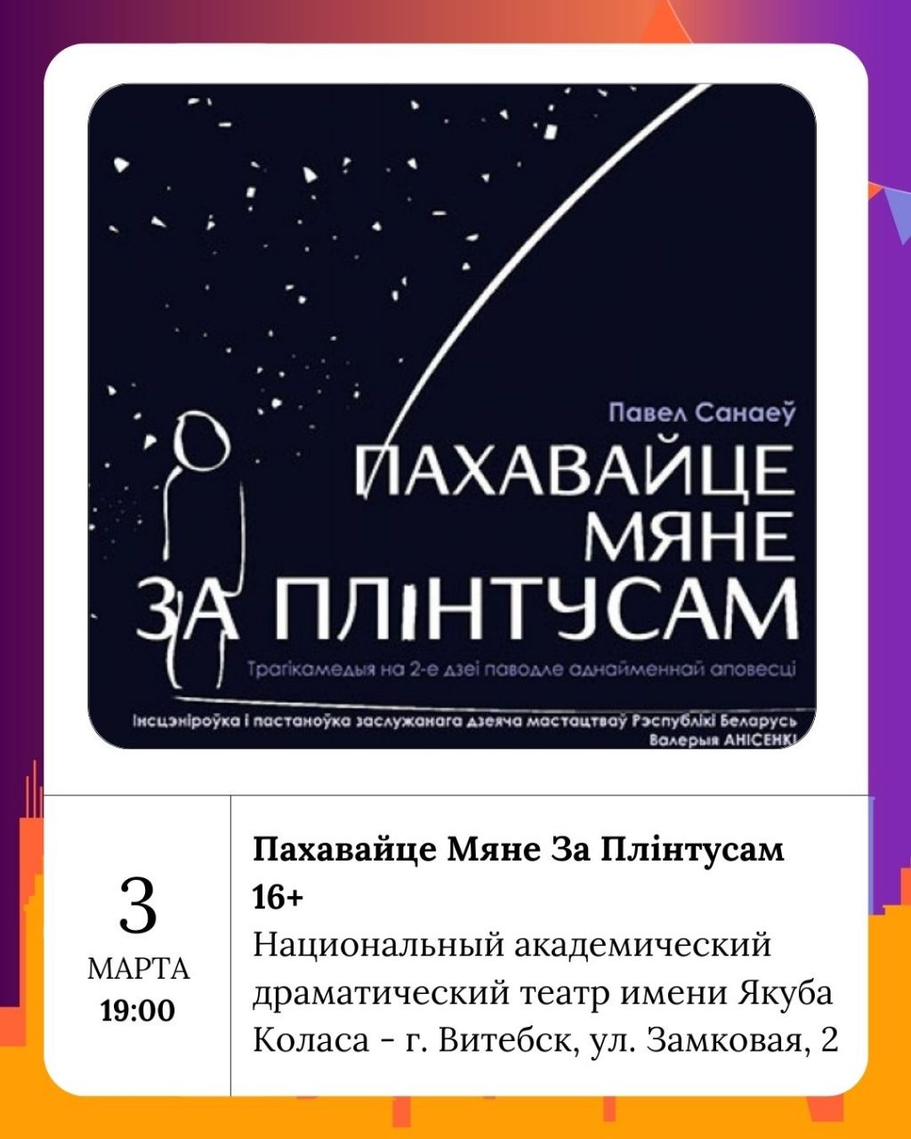 Вторник подарит ценителям театра возможность увидеть спектакль «Пахавайце Мяне За Плінтусам» (16+) в Национальном академическом драматическом театре имени Якуба Коласа. Глубокая и трогательная постановка, которая никого не оставит равнодушным.