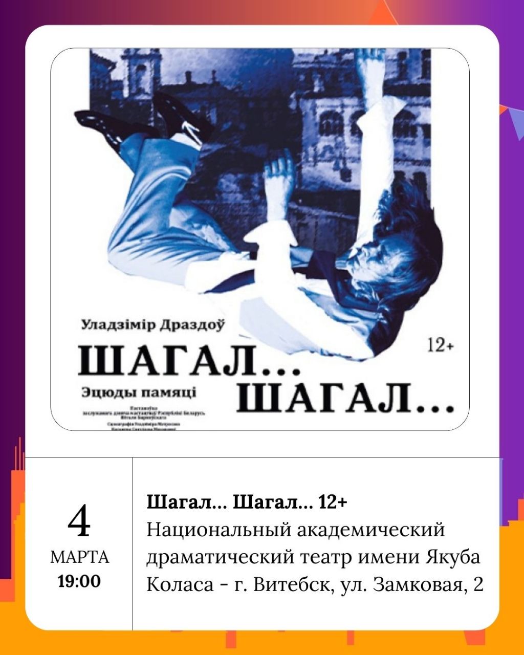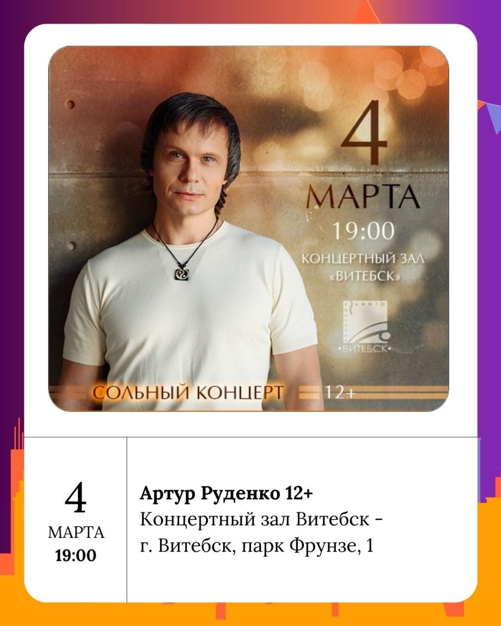 Середина недели порадует меломанов! В Концертном зале Витебск состоится сольный концерт «Артура Руденко» (12+). Насладитесь прекрасным вокалом и душевными песнями. Национальный академический драматический театр имени Якуба Коласа приглашает на спектакль «Шагал… Шагал…» (12+). Погрузитесь в мир великого художника.
