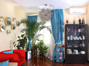 Как уменьшить окно? Иногда возникает необходимость визуально уменьшить окна и опустить потолки. При больших окнах для занавесей стоит использовать активные цвета. Найдите ткань с яркими фрагментами (например, абстрактный рисунок) и сделайте штору по форме окна. Получится эффект витража. Хороший результат дадут и яркие вставки на уровне глаз. Они отвлекут внимание от высокого потолка.